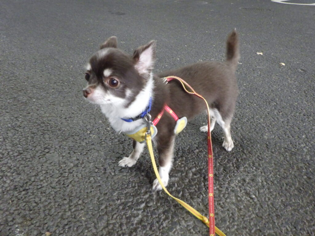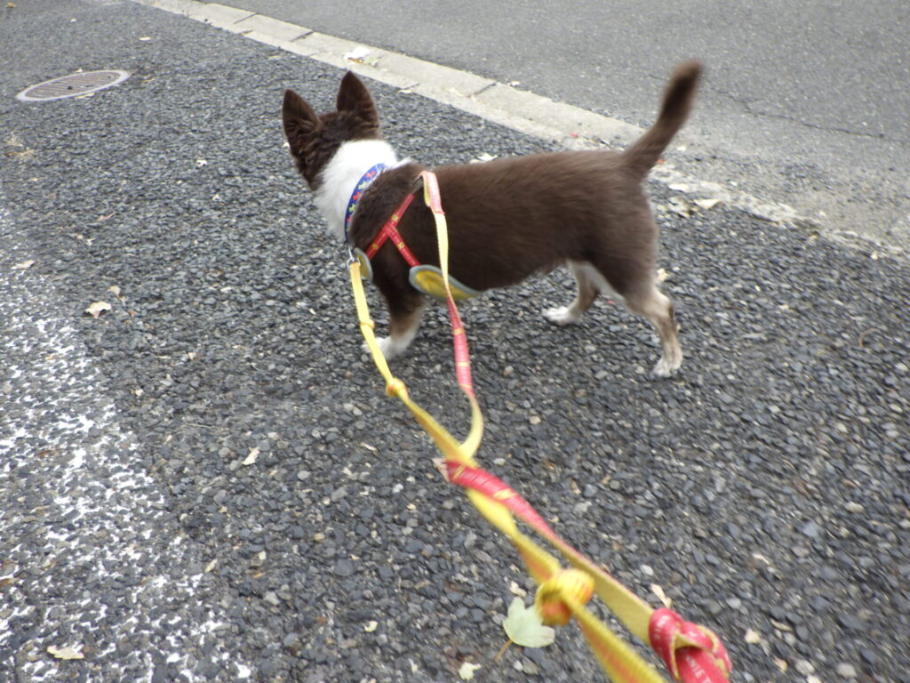 リードを付けた時は少し緊張して固まっていましたがすぐに慣れて楽しくお散歩できました!
